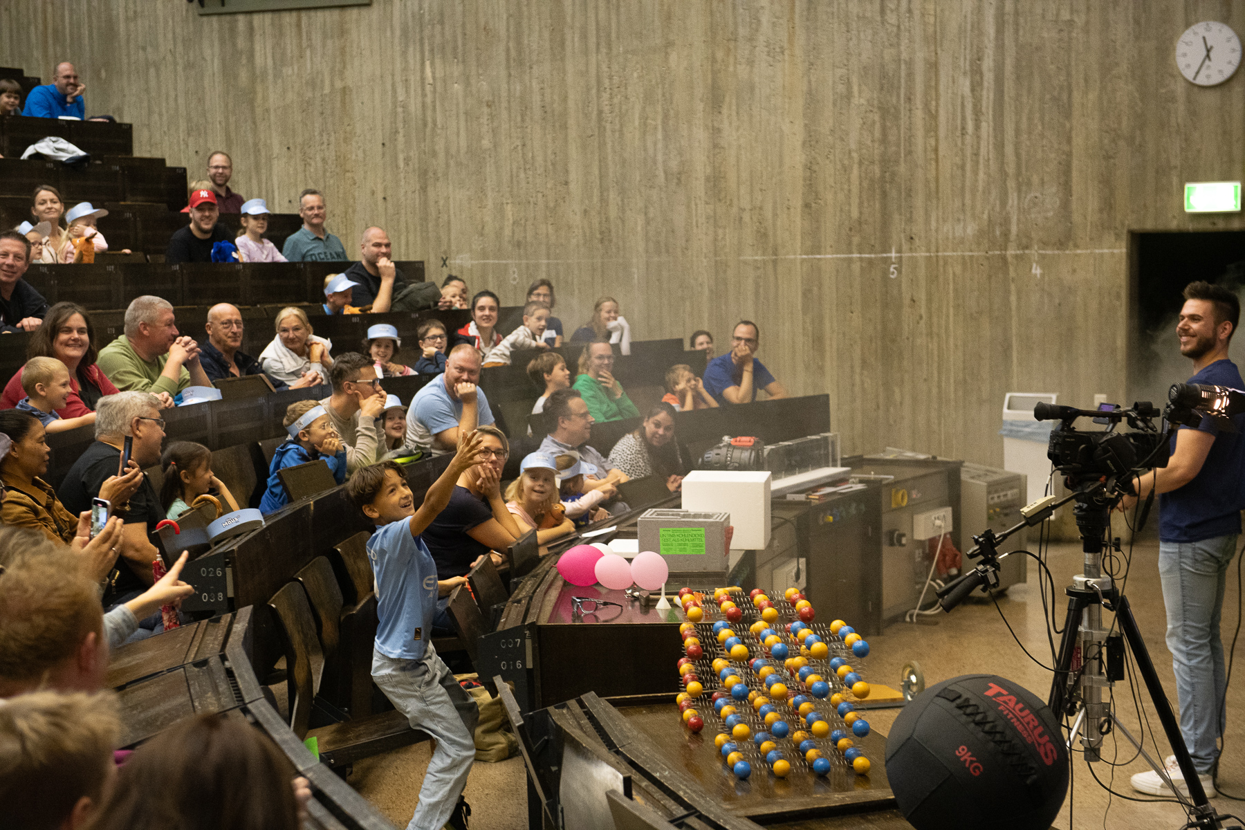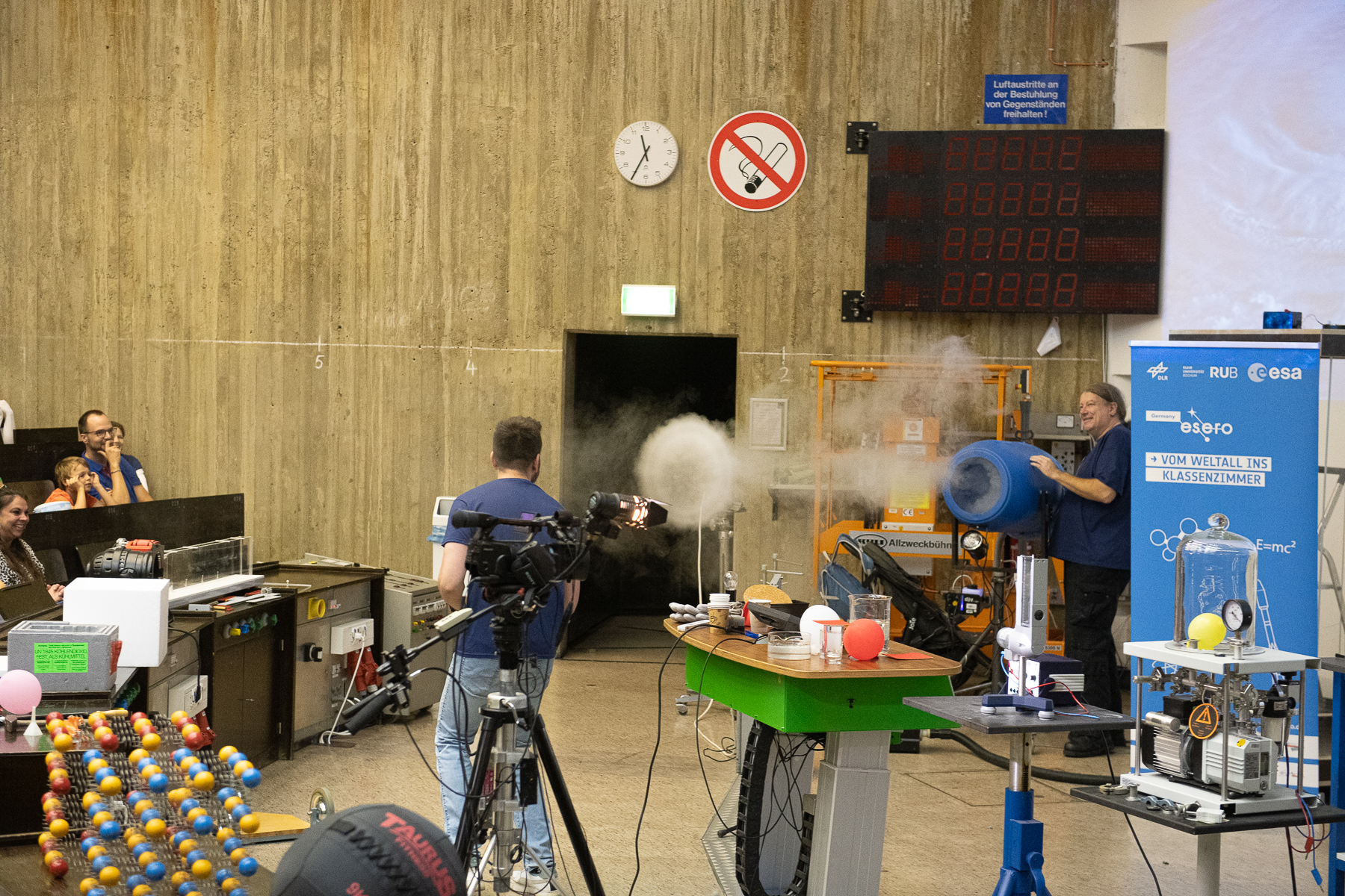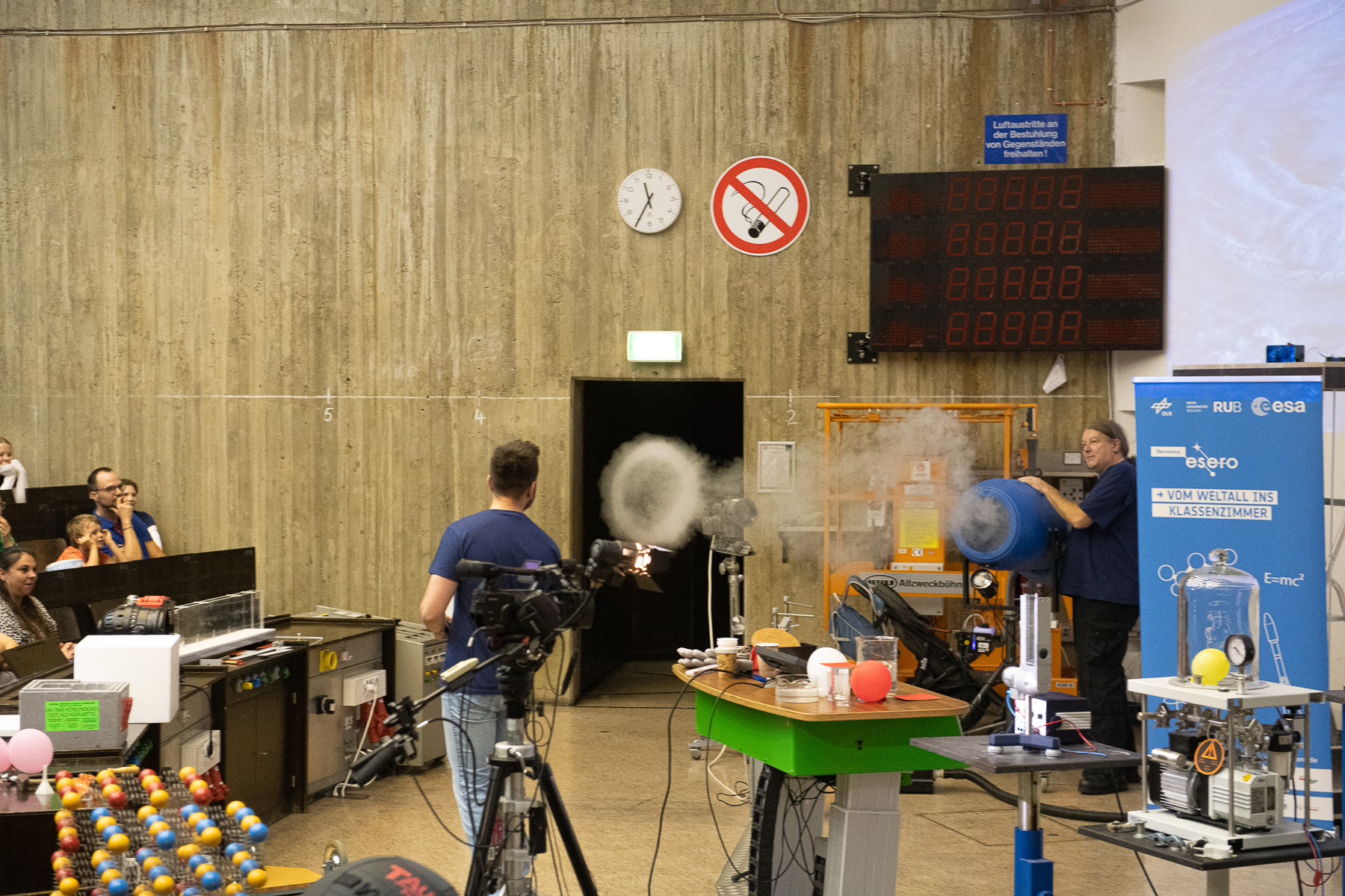 Glittering sherbet rockets, large fog rings, sour lemon batteries and much more could be discovered by curious mouse fans at the faculty's action day at the beginning of October. After the welcome by Prof. Dr. Ralf-Jürgen Dettmar, Dr. Niklas Fornefeld offered an exciting physics show for more than 70 children and their parents. The lecture hall technicians Hanno Niesler and Volker Hegenberg provided active support.