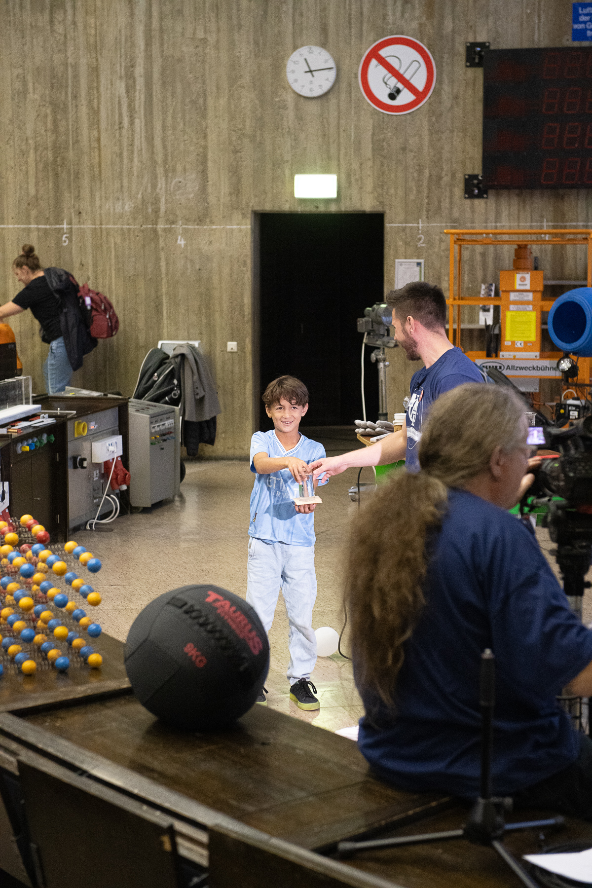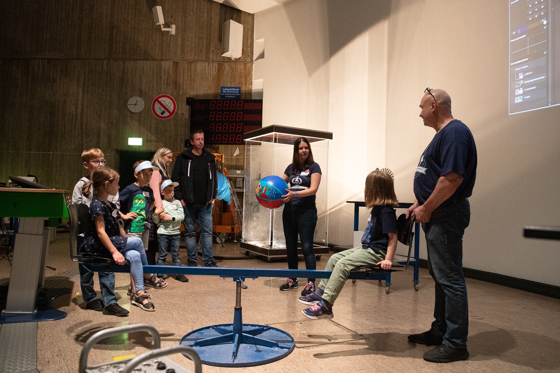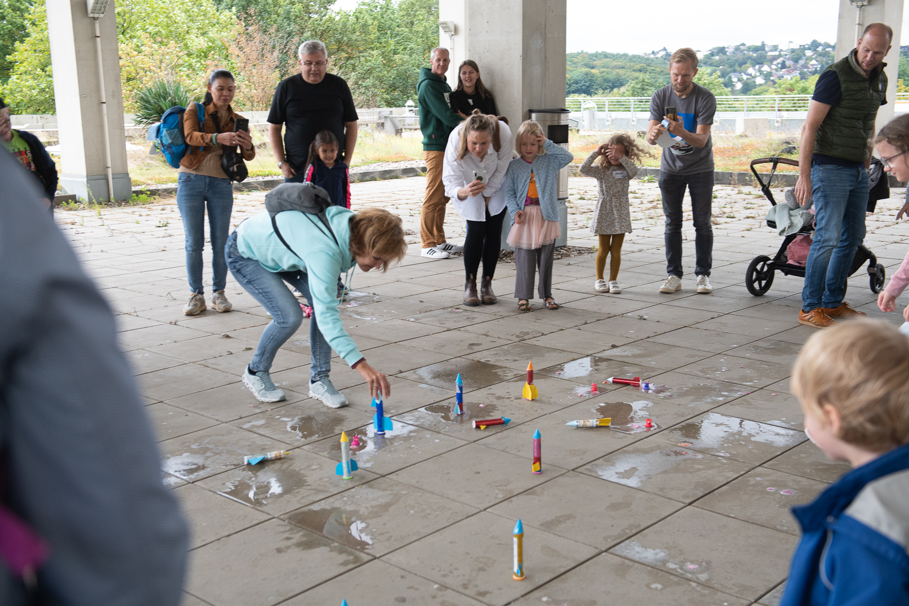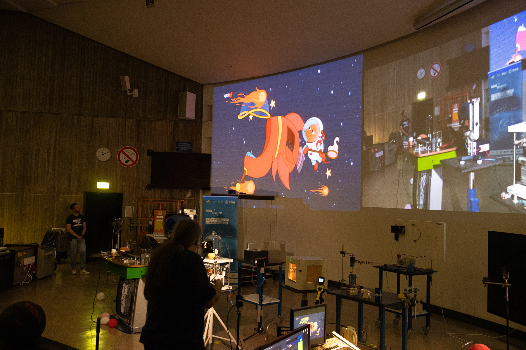 Glittering sherbet rockets, large fog rings, sour lemon batteries and much more could be discovered by curious mouse fans at the faculty's action day at the beginning of October. After the welcome by Prof. Dr. Ralf-Jürgen Dettmar, Dr. Niklas Fornefeld offered an exciting physics show for more than 70 children and their parents. The lecture hall technicians Hanno Niesler and Volker Hegenberg provided active support.