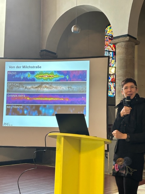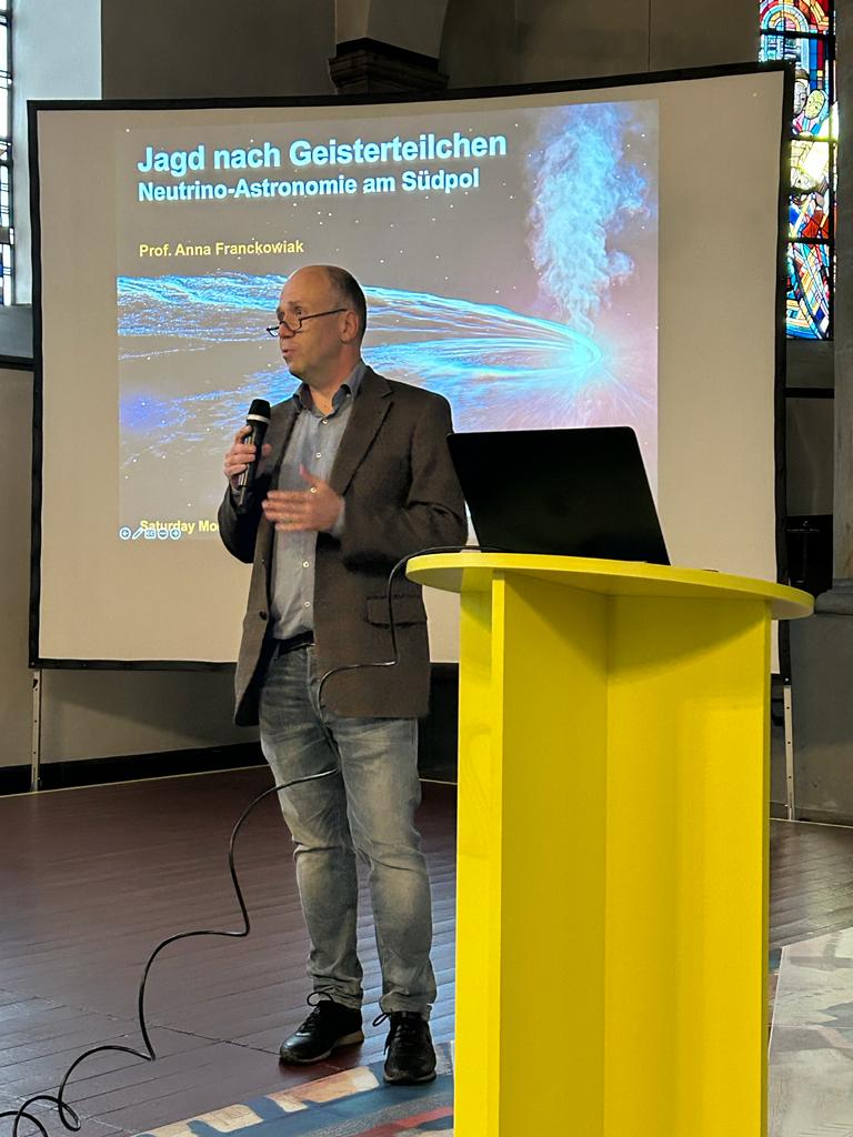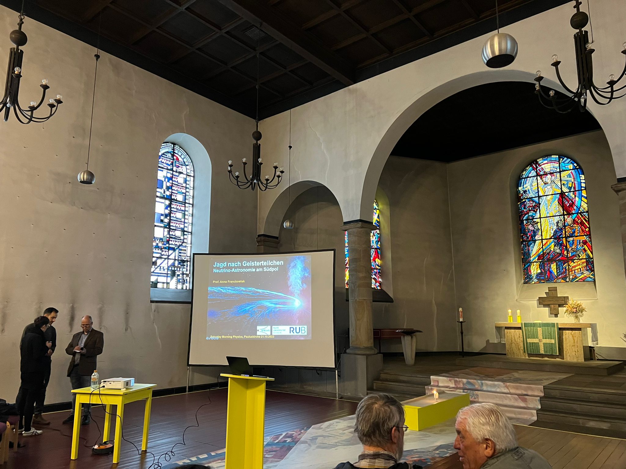 The smell of fresh waffles and an exciting lecture attracted curious listeners to the Pauluskirche in Bochum on Saturday, October 21. For the first time, a Saturday Morning Physics event of the RUB Faculty of Physics and Astronomy took place there. Host Pastor Constantin Decker and Associate Dean Prof. Ilya Eremin welcomed the interested audience and opened the lecture series for the winter semester 2023/2024. The faculty's student council provided fresh waffles and coffee before the lecture began, and Prof. Dr. Anna Franckowiak took the audience on an exciting hunt for ghost particles in the universe and spoke about neutrino astronomy at the South Pole.