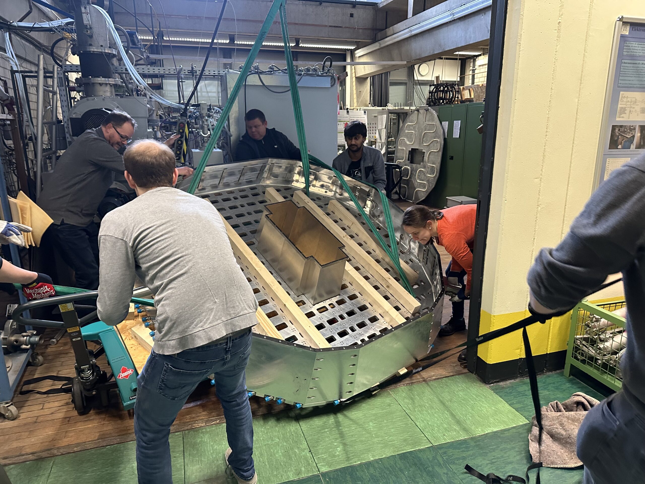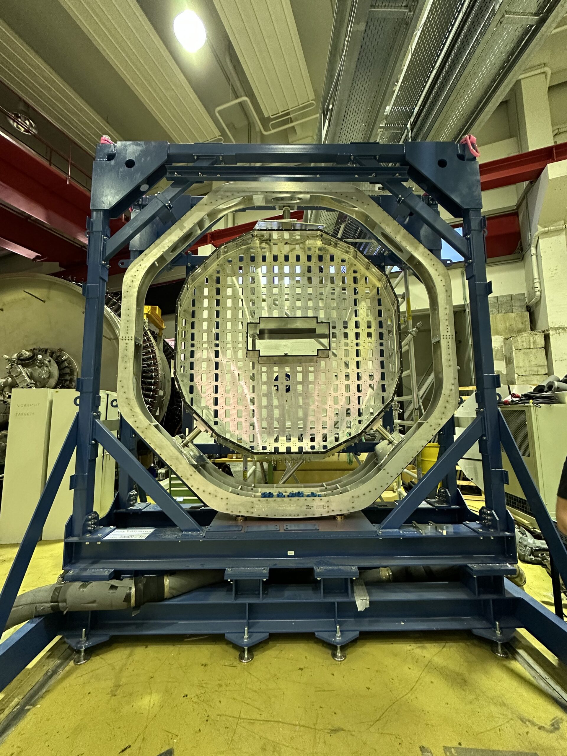A total of four cranes and dedicated PhD students and research assistants were needed until the forward end cap came to stand in its place at Forschungszentrum Jülich. The aluminum structure, which weighs 800 kg and is about 2.5 m wide, was erected by the Chair of Experimental Physics I in Bochum, including the complex cooling mechanism, over the past few years. In Jülich, it will be equipped in the coming months with a total of 3856 lead tungstate crystal units with a total weight of about 6 tons. These have been built by hand in Bochum over the last few years, thanks in part to the energetic help of the workshops and various technicians from other institutes. In July, the entire system will finally be put into operation for the first time at the proton beam of the COSY accelerator in Jülich. Here, pions and η-mesons will be produced and their decays recorded. With this beam time, the group around Prof. Dr. Ulrich Wiedner hopes to test and calibrate their components, developed over many years in numerous theses, in real beam operation.